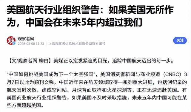 《好意思国航天行业组织警告:淌若好意思国无所动作,中国会在异日5年内杰出我们》,不雅察者网